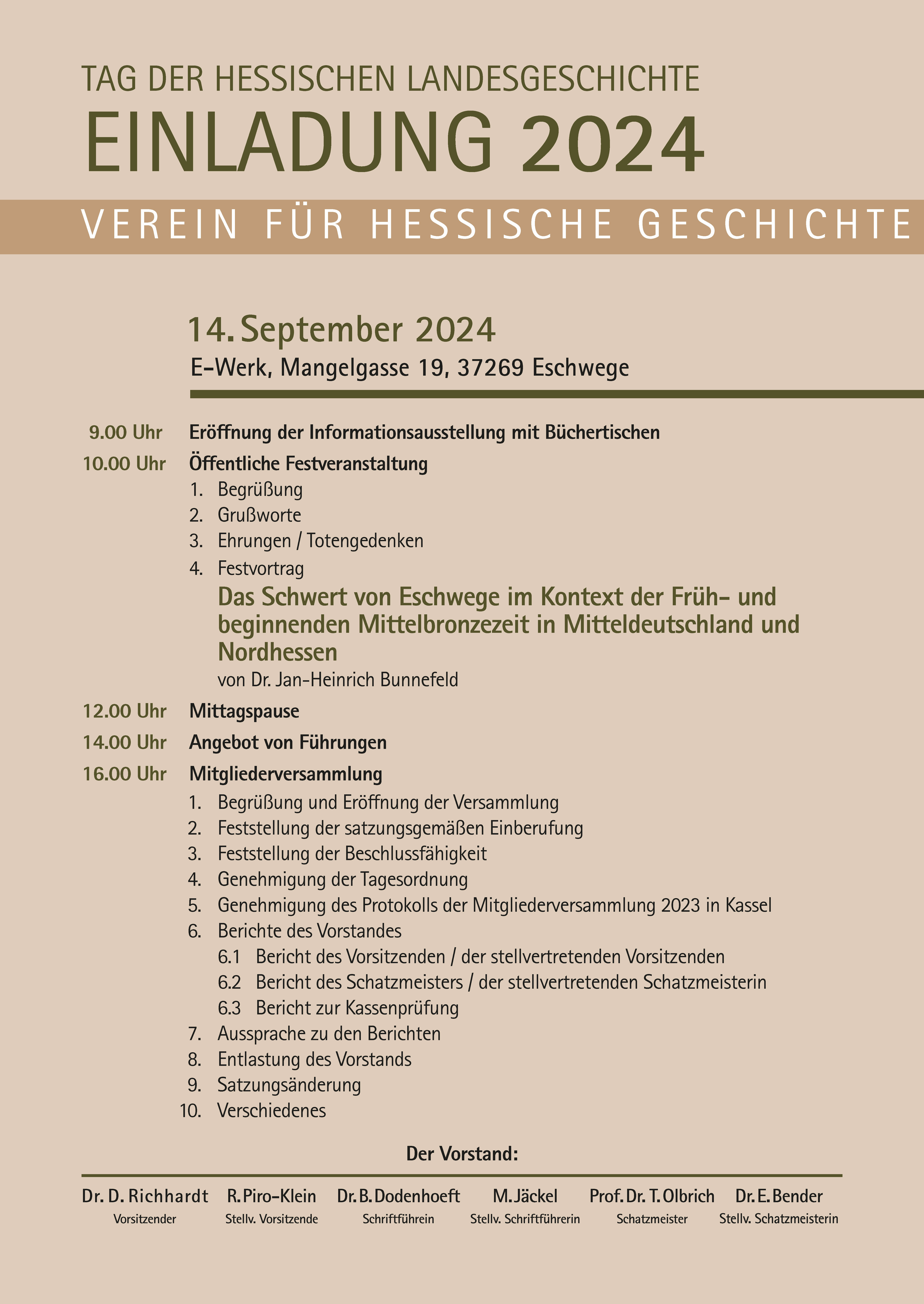 40 Zweigvereine V E R E I N F Ü R H E S S I S C H E G E S C H I C H T E 14. September 2024 E-Werk, Mangelgasse 19, 37269 Eschwege TAG DER HESSISCHEN LANDESGESCHICHTE EINLADUNG 2024 9.00 Uhr Eröffnung der Informationsausstellung mit Büchertischen 10.00 Uhr Öffentliche Festveranstaltung 1. Begrüßung 2. Grußworte 3. Ehrungen / Totengedenken 4. Festvortrag Das Schwert von Eschwege im Kontext der Früh- und beginnenden Mittelbronzezeit in Mitteldeutschland und Nordhessen von Dr. Jan-Heinrich Bunnefeld 12.00 Uhr Mittagspause 14.00 Uhr Angebot von Führungen 16.00 Uhr Mitgliederversammlung 1. Begrüßung und Eröffnung der Versammlung 2. Feststellung der satzungsgemäßen Einberufung 3. Feststellung der Beschlussfähigkeit 4. Genehmigung der Tagesordnung 5. Genehmigung des Protokolls der Mitgliederversammlung 2023 in Kassel 6. Berichte des Vorstandes 6.1 Bericht des Vorsitzenden / der stellvertretenden Vorsitzenden 6.2 Bericht des Schatzmeisters / der stellvertretenden Schatzmeisterin 6.3 Bericht zur Kassenprüfung 7. Aussprache zu den Berichten 8. Entlastung des Vorstands 9. Satzungsänderung 10. Verschiedenes Dr. D. Richhardt Vorsitzender R. Piro-Klein Stellv. Vorsitzende Dr. B. Dodenhoeft Schriftführein M. Jäckel Stellv. Schriftführerin Prof. Dr. T. Olbrich Schatzmeister Dr. E. Bender Stellv. Schatzmeisterin Der Vorstand: