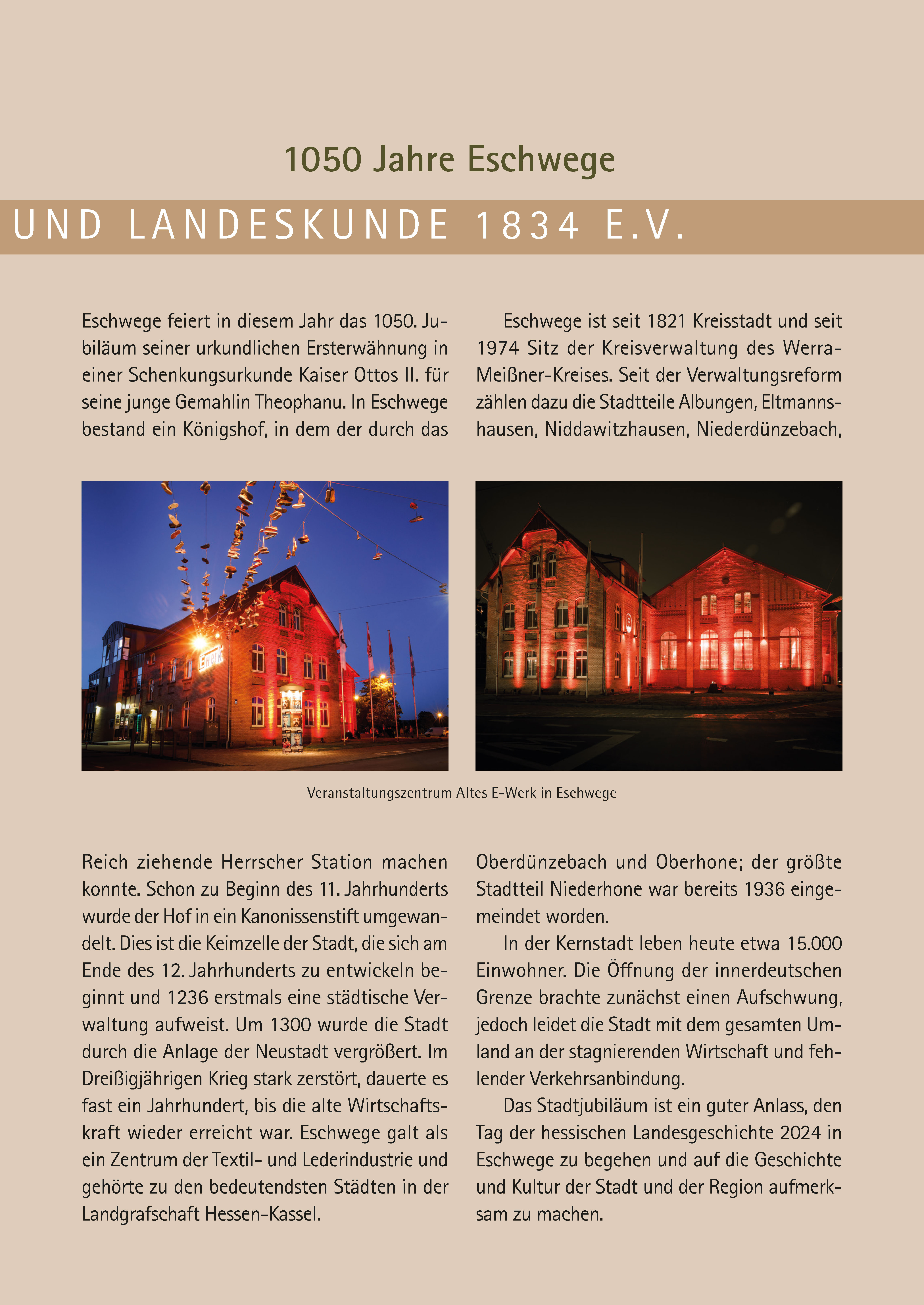 Zweigvereine 41 U N D L A N D E S K U N D E 1 8 3 4 E . V . 1050 Jahre Eschwege Eschwege feiert in diesem Jahr das 1050. Jubiläum seiner urkundlichen Ersterwähnung in einer Schenkungsurkunde Kaiser Ottos II. für seine junge Gemahlin Theophanu. In Eschwege bestand ein Königshof, in dem der durch das Reich ziehende Herrscher Station machen konnte. Schon zu Beginn des 11. Jahrhunderts wurde der Hof in ein Kanonissenstift umgewandelt. Dies ist die Keimzelle der Stadt, die sich am Ende des 12. Jahrhunderts zu entwickeln beginnt und 1236 erstmals eine städtische Verwaltung aufweist. Um 1300 wurde die Stadt durch die Anlage der Neustadt vergrößert. Im Dreißigjährigen Krieg stark zerstört, dauerte es fast ein Jahrhundert, bis die alte Wirtschaftskraft wieder erreicht war. Eschwege galt als ein Zentrum der Textil- und Lederindustrie und gehörte zu den bedeutendsten Städten in der Landgrafschaft Hessen-Kassel. Eschwege ist seit 1821 Kreisstadt und seit 1974 Sitz der Kreisverwaltung des Werra- Meißner-Kreises. Seit der Verwaltungsreform zählen dazu die Stadtteile Albungen, Eltmannshausen, Niddawitzhausen, Niederdünzebach, Oberdünzebach und Oberhone; der größte Stadtteil Niederhone war bereits 1936 eingemeindet worden. In der Kernstadt leben heute etwa 15.000 Einwohner. Die Öffnung der innerdeutschen Grenze brachte zunächst einen Aufschwung, jedoch leidet die Stadt mit dem gesamten Umland an der stagnierenden Wirtschaft und fehlender Verkehrsanbindung. Das Stadtjubiläum ist ein guter Anlass, den Tag der hessischen Landesgeschichte 2024 in Eschwege zu begehen und auf die Geschichte und Kultur der Stadt und der Region aufmerksam zu machen. Veranstaltungszentrum Altes E-Werk in Eschwege