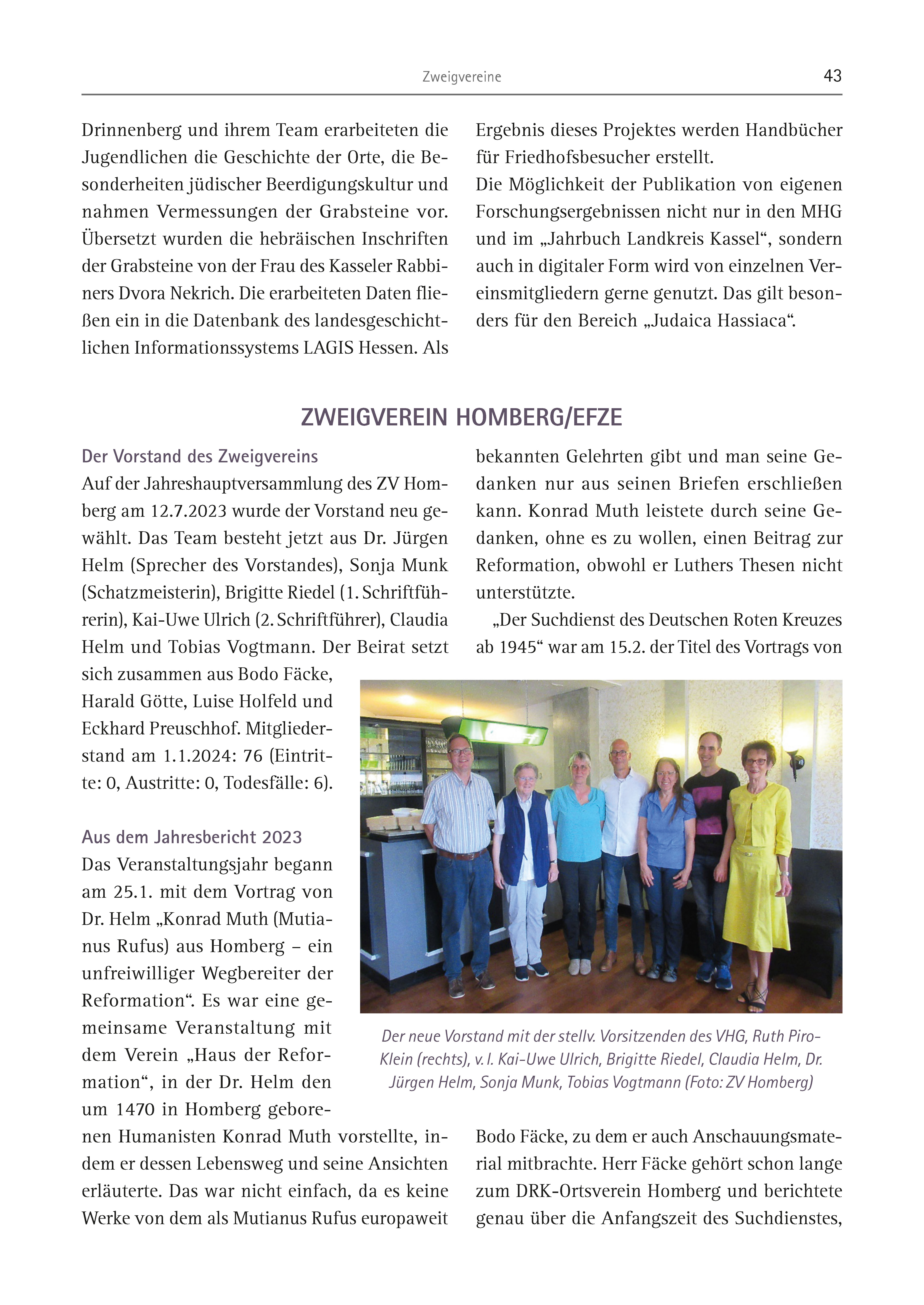 Zweigvereine 43 Der Vorstand des Zweigvereins Auf der Jahreshauptversammlung des ZV Homberg am 12.7.2023 wurde der Vorstand neu gewählt. Das Team besteht jetzt aus Dr. Jürgen Helm (Sprecher des Vorstandes), Sonja Munk (Schatzmeisterin), Brigitte Riedel (1. Schriftführerin), Kai-Uwe Ulrich (2. Schriftführer), Claudia Helm und Tobias Vogtmann. Der Beirat setzt sich zusammen aus Bodo Fäcke, Harald Götte, Luise Holfeld und Eckhard Preuschhof. Mitgliederstand am 1.1.2024: 76 (Eintritte: 0, Austritte: 0, Todesfälle: 6). Aus dem Jahresbericht 2023 Das Veranstaltungsjahr begann am 25.1. mit dem Vortrag von Dr. Helm „Konrad Muth (Mutianus Rufus) aus Homberg – ein unfreiwilliger Wegbereiter der Reformation“. Es war eine gemeinsame Veranstaltung mit dem Verein „Haus der Reformation“, in der Dr. Helm den um 1470 in Homberg geborenen Humanisten Konrad Muth vorstellte, indem er dessen Lebensweg und seine Ansichten erläuterte. Das war nicht einfach, da es keine Werke von dem als Mutianus Rufus europaweit bekannten Gelehrten gibt und man seine Gedanken nur aus seinen Briefen erschließen kann. Konrad Muth leistete durch seine Gedanken, ohne es zu wollen, einen Beitrag zur Reformation, obwohl er Luthers Thesen nicht unterstützte. „Der Suchdienst des Deutschen Roten Kreuzes ab 1945“ war am 15.2. der Titel des Vortrags von Bodo Fäcke, zu dem er auch Anschauungsmaterial mitbrachte. Herr Fäcke gehört schon lange zum DRK-Ortsverein Homberg und berichtete genau über die Anfangszeit des Suchdienstes, ZWEIGVEREIN HOMBERG/EFZE Drinnenberg und ihrem Team erarbeiteten die Jugendlichen die Geschichte der Orte, die Besonderheiten jüdischer Beerdigungskultur und nahmen Vermessungen der Grabsteine vor. Übersetzt wurden die hebräischen Inschriften der Grabsteine von der Frau des Kasseler Rabbiners Dvora Nekrich. Die erarbeiteten Daten fließen ein in die Datenbank des landesgeschichtlichen Informationssystems LAGIS Hessen. Als Ergebnis dieses Projektes werden Handbücher für Friedhofsbesucher erstellt. Die Möglichkeit der Publikation von eigenen Forschungsergebnissen nicht nur in den MHG und im „Jahrbuch Landkreis Kassel“, sondern auch in digitaler Form wird von einzelnen Vereinsmitgliedern gerne genutzt. Das gilt besonders für den Bereich „Judaica Hassiaca“. Der neue Vorstand mit der stellv. Vorsitzenden des VHG, Ruth Piro- Klein (rechts), v. l. Kai-Uwe Ulrich, Brigitte Riedel, Claudia Helm, Dr. Jürgen Helm, Sonja Munk, Tobias Vogtmann (Foto: ZV Homberg)