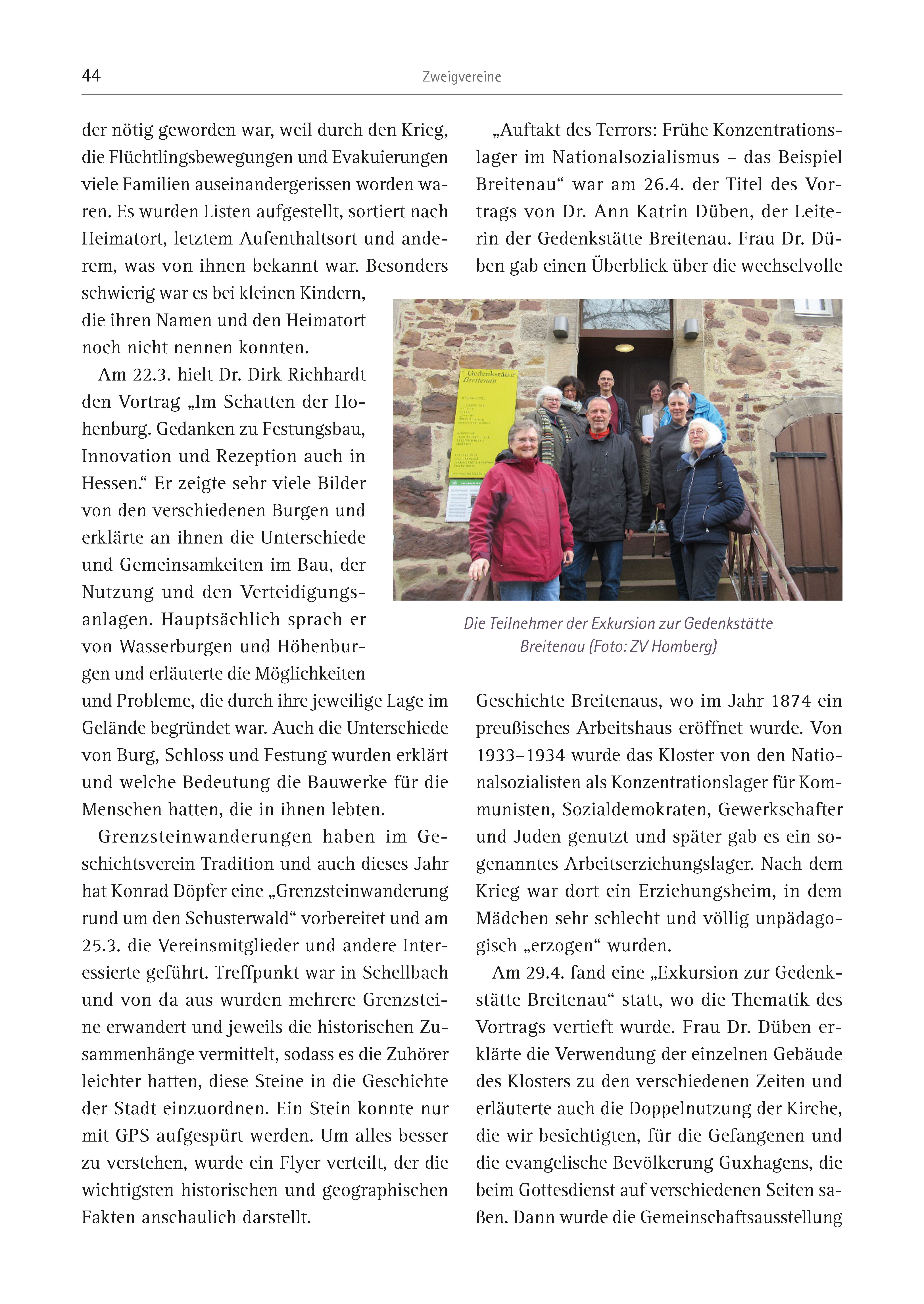 44 Zweigvereine der nötig geworden war, weil durch den Krieg, die Flüchtlingsbewegungen und Evakuierungen viele Familien auseinandergerissen worden waren. Es wurden Listen aufgestellt, sortiert nach Heimatort, letztem Aufenthaltsort und anderem, was von ihnen bekannt war. Besonders schwierig war es bei kleinen Kindern, die ihren Namen und den Heimatort noch nicht nennen konnten. Am 22.3. hielt Dr. Dirk Richhardt den Vortrag „Im Schatten der Hohenburg. Gedanken zu Festungsbau, Innovation und Rezeption auch in Hessen.“ Er zeigte sehr viele Bilder von den verschiedenen Burgen und erklärte an ihnen die Unterschiede und Gemeinsamkeiten im Bau, der Nutzung und den Verteidigungsanlagen. Hauptsächlich sprach er von Wasserburgen und Höhenburgen und erläuterte die Möglichkeiten und Probleme, die durch ihre jeweilige Lage im Gelände begründet war. Auch die Unterschiede von Burg, Schloss und Festung wurden erklärt und welche Bedeutung die Bauwerke für die Menschen hatten, die in ihnen lebten. Grenzsteinwanderungen haben im Geschichtsverein Tradition und auch dieses Jahr hat Konrad Döpfer eine „Grenzsteinwanderung rund um den Schusterwald“ vorbereitet und am 25.3. die Vereinsmitglieder und andere Interessierte geführt. Treffpunkt war in Schellbach und von da aus wurden mehrere Grenzsteine erwandert und jeweils die historischen Zusammenhänge vermittelt, sodass es die Zuhörer leichter hatten, diese Steine in die Geschichte der Stadt einzuordnen. Ein Stein konnte nur mit GPS aufgespürt werden. Um alles besser zu verstehen, wurde ein Flyer verteilt, der die wichtigsten historischen und geographischen Fakten anschaulich darstellt. „Auftakt des Terrors: Frühe Konzentrationslager im Nationalsozialismus – das Beispiel Breitenau“ war am 26.4. der Titel des Vortrags von Dr. Ann Katrin Düben, der Leiterin der Gedenkstätte Breitenau. Frau Dr. Düben gab einen Überblick über die wechselvolle Geschichte Breitenaus, wo im Jahr 1874 ein preußisches Arbeitshaus eröffnet wurde. Von 1933–1934 wurde das Kloster von den Nationalsozialisten als Konzentrationslager für Kommunisten, Sozialdemokraten, Gewerkschafter und Juden genutzt und später gab es ein sogenanntes Arbeitserziehungslager. Nach dem Krieg war dort ein Erziehungsheim, in dem Mädchen sehr schlecht und völlig unpädagogisch „erzogen“ wurden. Am 29.4. fand eine „Exkursion zur Gedenkstätte Breitenau“ statt, wo die Thematik des Vortrags vertieft wurde. Frau Dr. Düben erklärte die Verwendung der einzelnen Gebäude des Klosters zu den verschiedenen Zeiten und erläuterte auch die Doppelnutzung der Kirche, die wir besichtigten, für die Gefangenen und die evangelische Bevölkerung Guxhagens, die beim Gottesdienst auf verschiedenen Seiten saßen. Dann wurde die Gemeinschaftsausstellung Die Teilnehmer der Exkursion zur Gedenkstätte Breitenau (Foto: ZV Homberg)