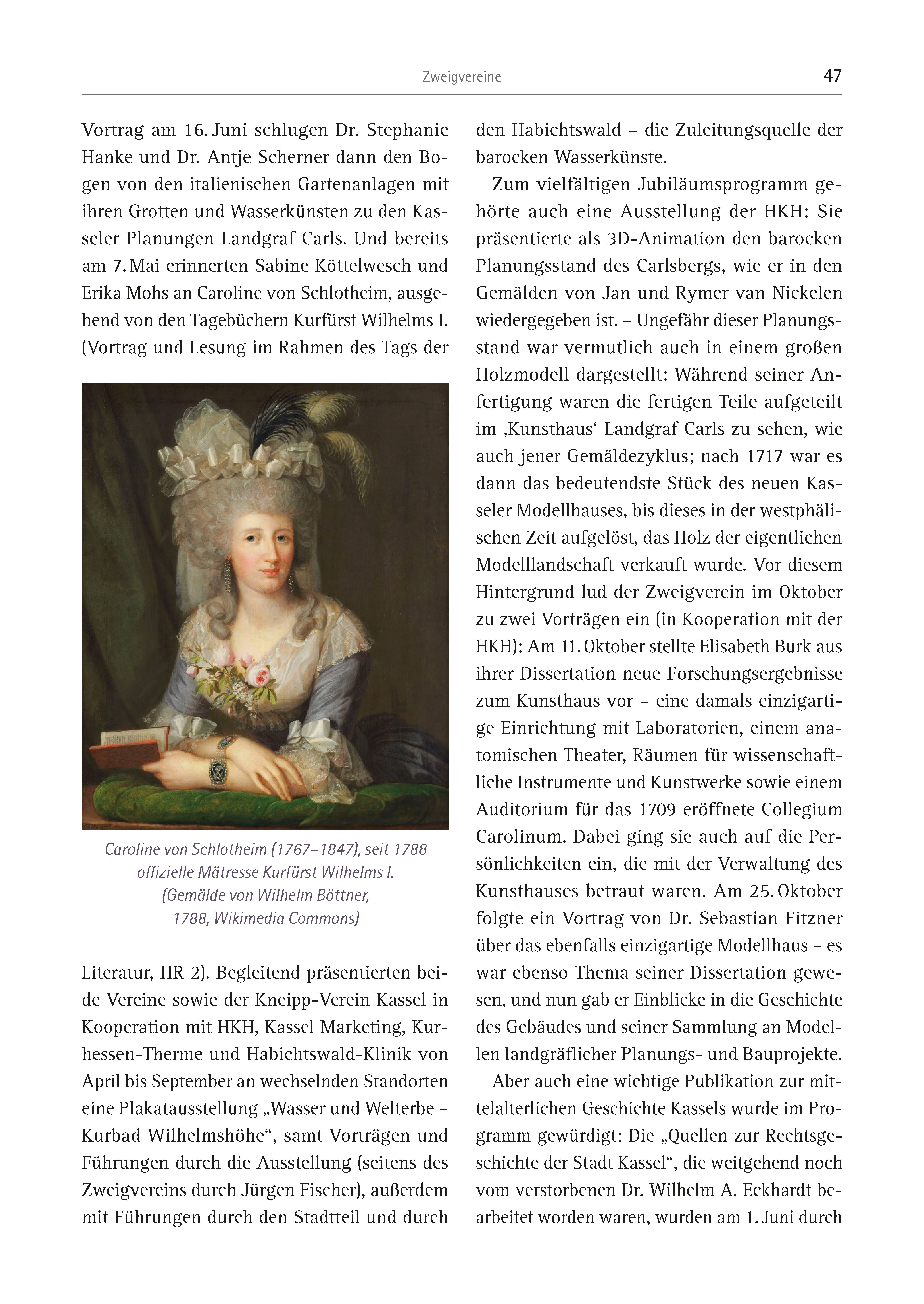 Zweigvereine 47 Vortrag am 16. Juni schlugen Dr. Stephanie Hanke und Dr. Antje Scherner dann den Bogen von den italienischen Gartenanlagen mit ihren Grotten und Wasserkünsten zu den Kasseler Planungen Landgraf Carls. Und bereits am 7. Mai erinnerten Sabine Köttelwesch und Erika Mohs an Caroline von Schlotheim, ausgehend von den Tagebüchern Kurfürst Wilhelms I. (Vortrag und Lesung im Rahmen des Tags der Literatur, HR 2). Begleitend präsentierten beide Vereine sowie der Kneipp-Verein Kassel in Kooperation mit HKH, Kassel Marketing, Kurhessen- Therme und Habichtswald-Klinik von April bis September an wechselnden Standorten eine Plakatausstellung „Wasser und Welterbe – Kurbad Wilhelmshöhe“, samt Vorträgen und Führungen durch die Ausstellung (seitens des Zweigvereins durch Jürgen Fischer), außerdem mit Führungen durch den Stadtteil und durch den Habichtswald – die Zuleitungsquelle der barocken Wasserkünste. Zum vielfältigen Jubiläumsprogramm gehörte auch eine Ausstellung der HKH: Sie präsentierte als 3D-Animation den barocken Planungsstand des Carlsbergs, wie er in den Gemälden von Jan und Rymer van Nickelen wiedergegeben ist. – Ungefähr dieser Planungsstand war vermutlich auch in einem großen Holzmodell dargestellt: Während seiner Anfertigung waren die fertigen Teile aufgeteilt im ‚Kunsthaus‘ Landgraf Carls zu sehen, wie auch jener Gemäldezyklus; nach 1717 war es dann das bedeutendste Stück des neuen Kasseler Modellhauses, bis dieses in der westphälischen Zeit aufgelöst, das Holz der eigentlichen Modelllandschaft verkauft wurde. Vor diesem Hintergrund lud der Zweigverein im Oktober zu zwei Vorträgen ein (in Kooperation mit der HKH): Am 11. Oktober stellte Elisabeth Burk aus ihrer Dissertation neue Forschungsergebnisse zum Kunsthaus vor – eine damals einzigartige Einrichtung mit Laboratorien, einem anatomischen Theater, Räumen für wissenschaftliche Instrumente und Kunstwerke sowie einem Auditorium für das 1709 eröffnete Collegium Carolinum. Dabei ging sie auch auf die Persönlichkeiten ein, die mit der Verwaltung des Kunsthauses betraut waren. Am 25. Oktober folgte ein Vortrag von Dr. Sebastian Fitzner über das ebenfalls einzigartige Modellhaus – es war ebenso Thema seiner Dissertation gewesen, und nun gab er Einblicke in die Geschichte des Gebäudes und seiner Sammlung an Modellen landgräflicher Planungs- und Bauprojekte. Aber auch eine wichtige Publikation zur mittelalterlichen Geschichte Kassels wurde im Programm gewürdigt: Die „Quellen zur Rechtsgeschichte der Stadt Kassel“, die weitgehend noch vom verstorbenen Dr. Wilhelm A. Eckhardt bearbeitet worden waren, wurden am 1. Juni durch Caroline von Schlotheim (1767–1847), seit 1788 offizielle Mätresse Kurfürst Wilhelms I. (Gemälde von Wilhelm Böttner, 1788, Wikimedia Commons)