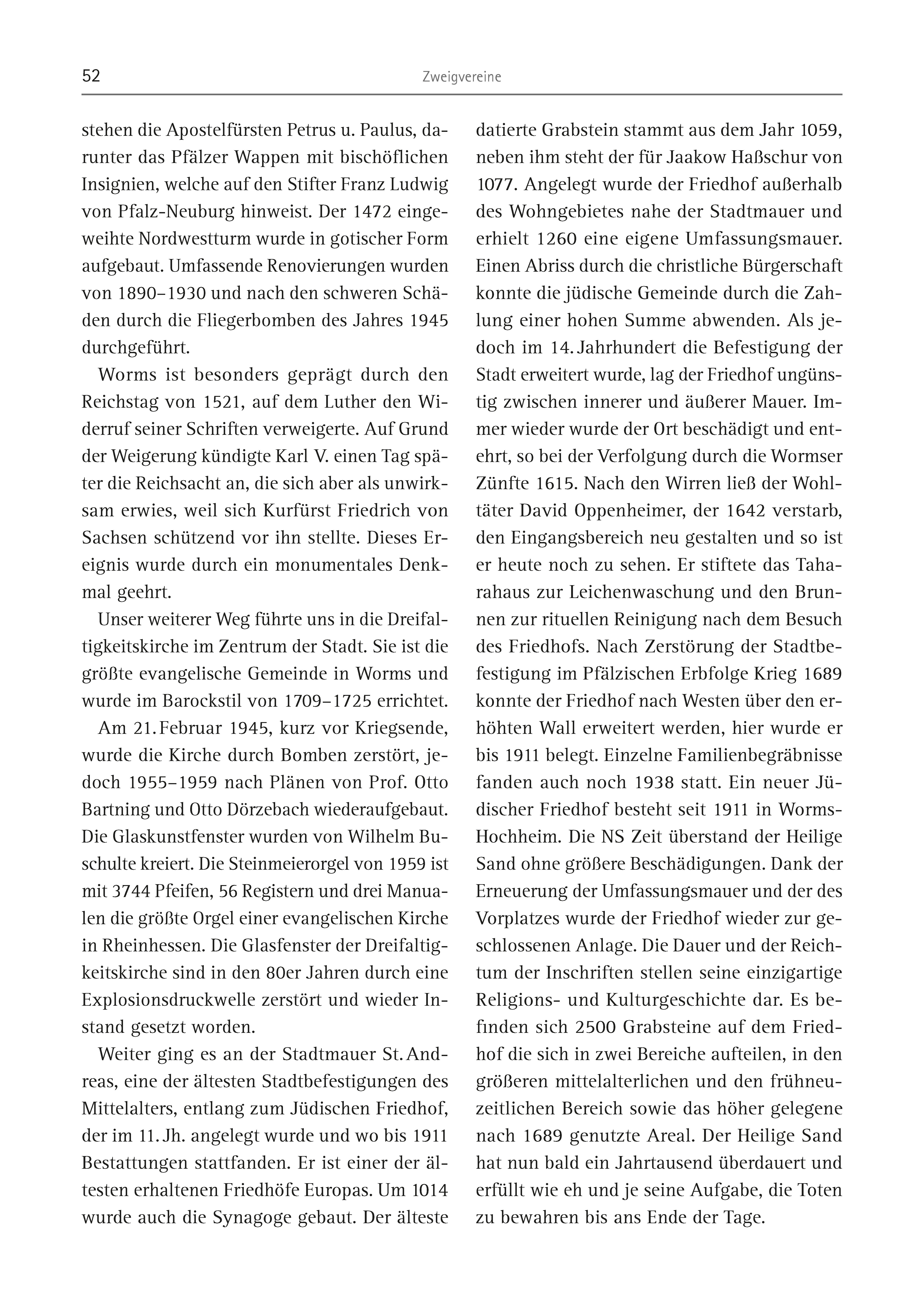 52 Zweigvereine stehen die Apostelfürsten Petrus u. Paulus, darunter das Pfälzer Wappen mit bischöflichen Insignien, welche auf den Stifter Franz Ludwig von Pfalz-Neuburg hinweist. Der 1472 eingeweihte Nordwestturm wurde in gotischer Form aufgebaut. Umfassende Renovierungen wurden von 1890–1930 und nach den schweren Schäden durch die Fliegerbomben des Jahres 1945 durchgeführt. Worms ist besonders geprägt durch den Reichstag von 1521, auf dem Luther den Widerruf seiner Schriften verweigerte. Auf Grund der Weigerung kündigte Karl V. einen Tag später die Reichsacht an, die sich aber als unwirksam erwies, weil sich Kurfürst Friedrich von Sachsen schützend vor ihn stellte. Dieses Ereignis wurde durch ein monumentales Denkmal geehrt. Unser weiterer Weg führte uns in die Dreifaltigkeitskirche im Zentrum der Stadt. Sie ist die größte evangelische Gemeinde in Worms und wurde im Barockstil von 1709–1725 errichtet. Am 21. Februar 1945, kurz vor Kriegsende, wurde die Kirche durch Bomben zerstört, jedoch 1955–1959 nach Plänen von Prof. Otto Bartning und Otto Dörzebach wiederaufgebaut. Die Glaskunstfenster wurden von Wilhelm Buschulte kreiert. Die Steinmeierorgel von 1959 ist mit 3744 Pfeifen, 56 Registern und drei Manualen die größte Orgel einer evangelischen Kirche in Rheinhessen. Die Glasfenster der Dreifaltigkeitskirche sind in den 80er Jahren durch eine Explosionsdruckwelle zerstört und wieder Instand gesetzt worden. Weiter ging es an der Stadtmauer St. Andreas, eine der ältesten Stadtbefestigungen des Mittelalters, entlang zum Jüdischen Friedhof, der im 11. Jh. angelegt wurde und wo bis 1911 Bestattungen stattfanden. Er ist einer der ältesten erhaltenen Friedhöfe Europas. Um 1014 wurde auch die Synagoge gebaut. Der älteste datierte Grabstein stammt aus dem Jahr 1059, neben ihm steht der für Jaakow Haßschur von 1077. Angelegt wurde der Friedhof außerhalb des Wohngebietes nahe der Stadtmauer und erhielt 1260 eine eigene Umfassungsmauer. Einen Abriss durch die christliche Bürgerschaft konnte die jüdische Gemeinde durch die Zahlung einer hohen Summe abwenden. Als jedoch im 14. Jahrhundert die Befestigung der Stadt erweitert wurde, lag der Friedhof ungünstig zwischen innerer und äußerer Mauer. Immer wieder wurde der Ort beschädigt und entehrt, so bei der Verfolgung durch die Wormser Zünfte 1615. Nach den Wirren ließ der Wohltäter David Oppenheimer, der 1642 verstarb, den Eingangsbereich neu gestalten und so ist er heute noch zu sehen. Er stiftete das Taharahaus zur Leichenwaschung und den Brunnen zur rituellen Reinigung nach dem Besuch des Friedhofs. Nach Zerstörung der Stadtbefestigung im Pfälzischen Erbfolge Krieg 1689 konnte der Friedhof nach Westen über den erhöhten Wall erweitert werden, hier wurde er bis 1911 belegt. Einzelne Familienbegräbnisse fanden auch noch 1938 statt. Ein neuer Jüdischer Friedhof besteht seit 1911 in Worms- Hochheim. Die NS Zeit überstand der Heilige Sand ohne größere Beschädigungen. Dank der Erneuerung der Umfassungsmauer und der des Vorplatzes wurde der Friedhof wieder zur geschlossenen Anlage. Die Dauer und der Reichtum der Inschriften stellen seine einzigartige Religions- und Kulturgeschichte dar. Es befinden sich 2500 Grabsteine auf dem Friedhof die sich in zwei Bereiche aufteilen, in den größeren mittelalterlichen und den frühneuzeitlichen Bereich sowie das höher gelegene nach 1689 genutzte Areal. Der Heilige Sand hat nun bald ein Jahrtausend überdauert und erfüllt wie eh und je seine Aufgabe, die Toten zu bewahren bis ans Ende der Tage.