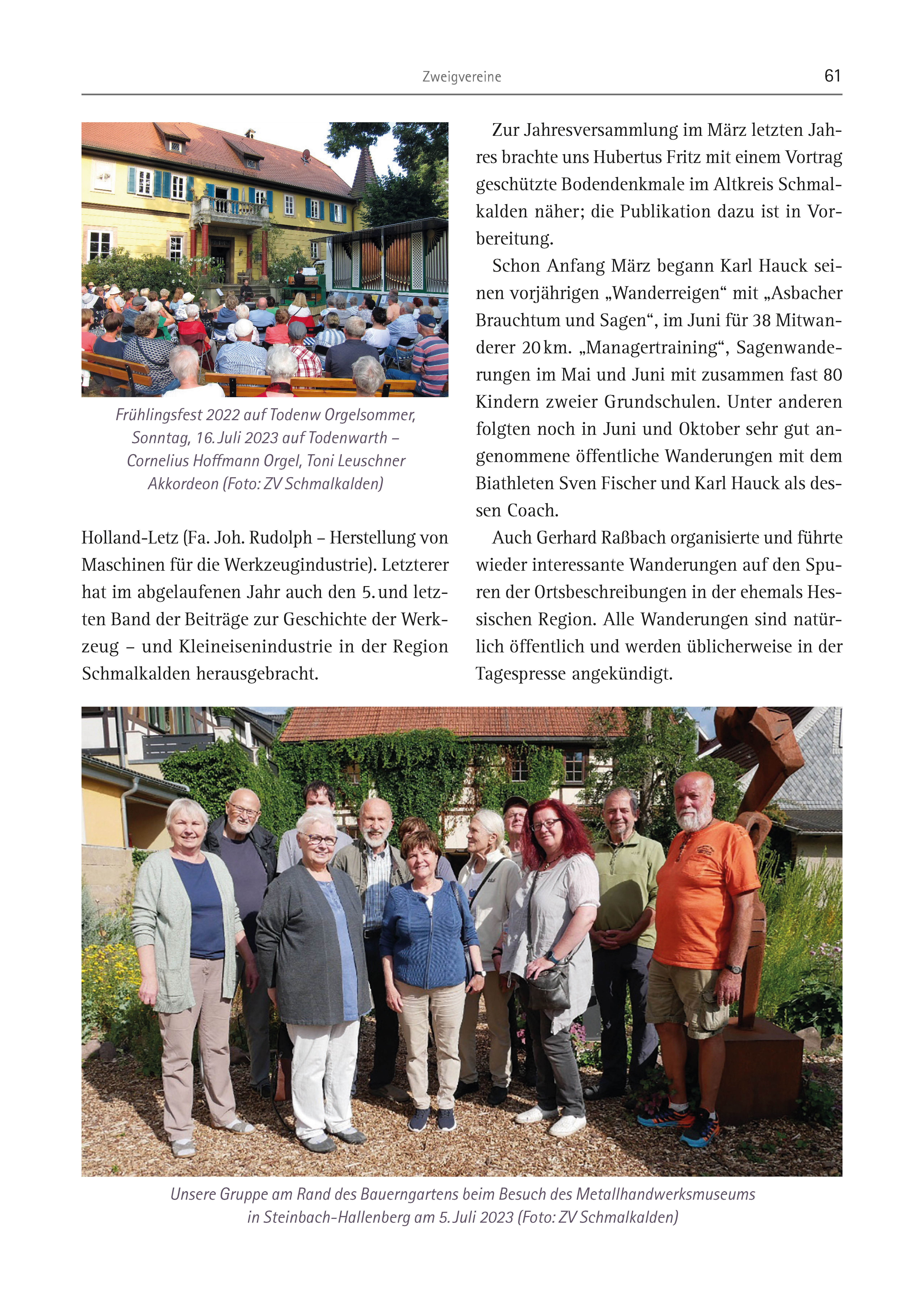 Zweigvereine 61 Holland-Letz (Fa. Joh. Rudolph – Herstellung von Maschinen für die Werkzeugindustrie). Letzterer hat im abgelaufenen Jahr auch den 5. und letzten Band der Beiträge zur Geschichte der Werkzeug – und Kleineisenindustrie in der Region Schmalkalden herausgebracht. Zur Jahresversammlung im März letzten Jahres brachte uns Hubertus Fritz mit einem Vortrag geschützte Bodendenkmale im Altkreis Schmalkalden näher; die Publikation dazu ist in Vorbereitung. Schon Anfang März begann Karl Hauck seinen vorjährigen „Wanderreigen“ mit „Asbacher Brauchtum und Sagen“, im Juni für 38 Mitwanderer 20 km. „Managertraining“, Sagenwanderungen im Mai und Juni mit zusammen fast 80 Kindern zweier Grundschulen. Unter anderen folgten noch in Juni und Oktober sehr gut angenommene öffentliche Wanderungen mit dem Biathleten Sven Fischer und Karl Hauck als dessen Coach. Auch Gerhard Raßbach organisierte und führte wieder interessante Wanderungen auf den Spuren der Ortsbeschreibungen in der ehemals Hessischen Region. Alle Wanderungen sind natürlich öffentlich und werden üblicherweise in der Tagespresse angekündigt. Frühlingsfest 2022 auf Todenw Orgelsommer, Sonntag, 16. Juli 2023 auf Todenwarth – Cornelius Hoffmann Orgel, Toni Leuschner Akkordeon (Foto: ZV Schmalkalden) Unsere Gruppe am Rand des Bauerngartens beim Besuch des Metallhandwerksmuseums in Steinbach-Hallenberg am 5. Juli 2023 (Foto: ZV Schmalkalden)