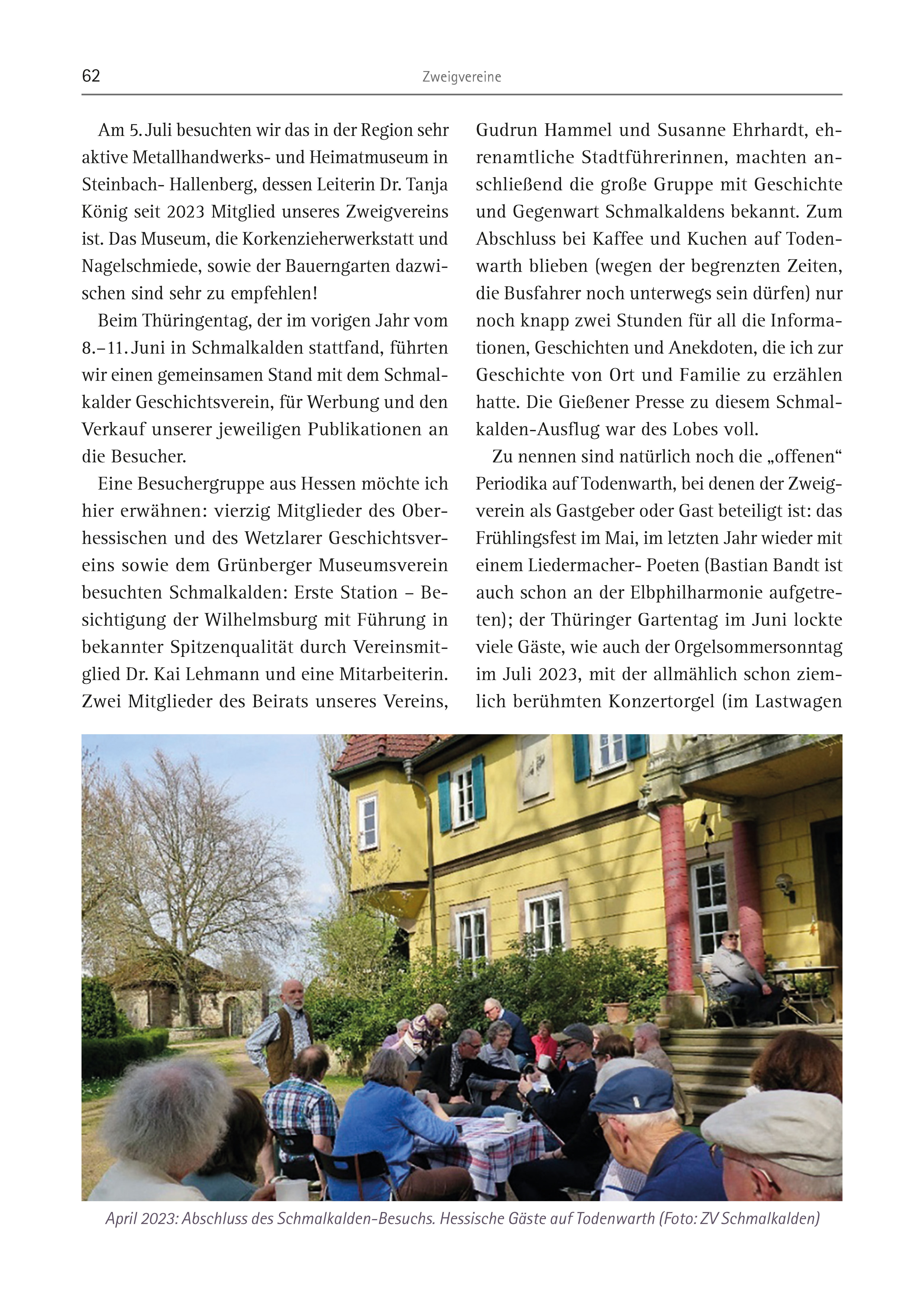 62 Zweigvereine Am 5. Juli besuchten wir das in der Region sehr aktive Metallhandwerks- und Heimatmuseum in Steinbach- Hallenberg, dessen Leiterin Dr. Tanja König seit 2023 Mitglied unseres Zweigvereins ist. Das Museum, die Korkenzieherwerkstatt und Nagelschmiede, sowie der Bauerngarten dazwischen sind sehr zu empfehlen! Beim Thüringentag, der im vorigen Jahr vom 8.–11. Juni in Schmalkalden stattfand, führten wir einen gemeinsamen Stand mit dem Schmalkalder Geschichtsverein, für Werbung und den Verkauf unserer jeweiligen Publikationen an die Besucher. Eine Besuchergruppe aus Hessen möchte ich hier erwähnen: vierzig Mitglieder des Oberhessischen und des Wetzlarer Geschichtsvereins sowie dem Grünberger Museumsverein besuchten Schmalkalden: Erste Station – Besichtigung der Wilhelmsburg mit Führung in bekannter Spitzenqualität durch Vereinsmitglied Dr. Kai Lehmann und eine Mitarbeiterin. Zwei Mitglieder des Beirats unseres Vereins, Gudrun Hammel und Susanne Ehrhardt, ehrenamtliche Stadtführerinnen, machten anschließend die große Gruppe mit Geschichte und Gegenwart Schmalkaldens bekannt. Zum Abschluss bei Kaffee und Kuchen auf Todenwarth blieben (wegen der begrenzten Zeiten, die Busfahrer noch unterwegs sein dürfen) nur noch knapp zwei Stunden für all die Informationen, Geschichten und Anekdoten, die ich zur Geschichte von Ort und Familie zu erzählen hatte. Die Gießener Presse zu diesem Schmalkalden- Ausflug war des Lobes voll. Zu nennen sind natürlich noch die „offenen“ Periodika auf Todenwarth, bei denen der Zweigverein als Gastgeber oder Gast beteiligt ist: das Frühlingsfest im Mai, im letzten Jahr wieder mit einem Liedermacher- Poeten (Bastian Bandt ist auch schon an der Elbphilharmonie aufgetreten); der Thüringer Gartentag im Juni lockte viele Gäste, wie auch der Orgelsommersonntag im Juli 2023, mit der allmählich schon ziemlich berühmten Konzertorgel (im Lastwagen April 2023: Abschluss des Schmalkalden-Besuchs. Hessische Gäste auf Todenwarth (Foto: ZV Schmalkalden)