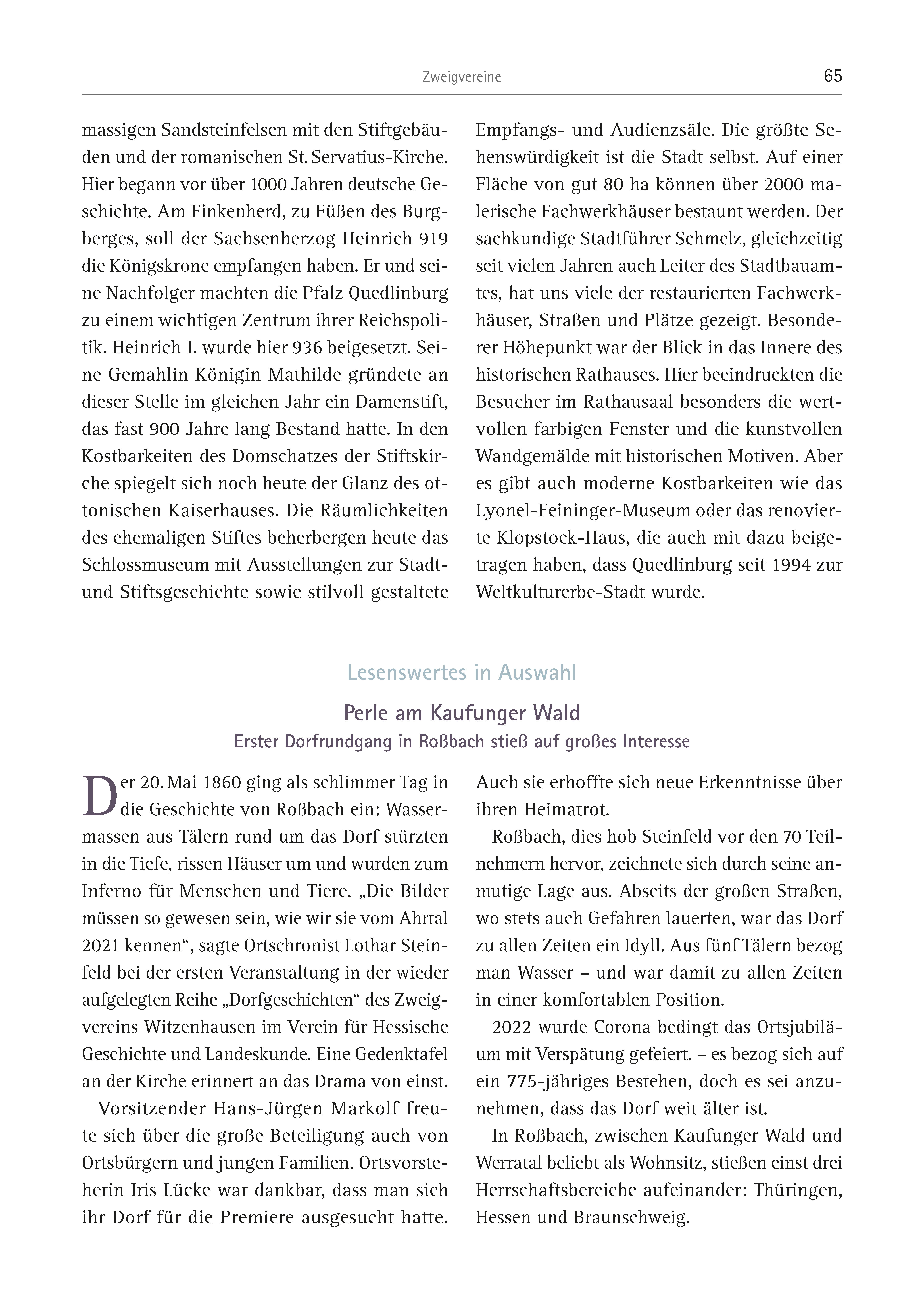Zweigvereine 65 massigen Sandsteinfelsen mit den Stiftgebäuden und der romanischen St. Servatius-Kirche. Hier begann vor über 1000 Jahren deutsche Geschichte. Am Finkenherd, zu Füßen des Burgberges, soll der Sachsenherzog Heinrich 919 die Königskrone empfangen haben. Er und seine Nachfolger machten die Pfalz Quedlinburg zu einem wichtigen Zentrum ihrer Reichspolitik. Heinrich I. wurde hier 936 beigesetzt. Seine Gemahlin Königin Mathilde gründete an dieser Stelle im gleichen Jahr ein Damenstift, das fast 900 Jahre lang Bestand hatte. In den Kostbarkeiten des Domschatzes der Stiftskirche spiegelt sich noch heute der Glanz des ottonischen Kaiserhauses. Die Räumlichkeiten des ehemaligen Stiftes beherbergen heute das Schlossmuseum mit Ausstellungen zur Stadtund Stiftsgeschichte sowie stilvoll gestaltete Empfangs- und Audienzsäle. Die größte Sehenswürdigkeit ist die Stadt selbst. Auf einer Fläche von gut 80 ha können über 2000 malerische Fachwerkhäuser bestaunt werden. Der sachkundige Stadtführer Schmelz, gleichzeitig seit vielen Jahren auch Leiter des Stadtbauamtes, hat uns viele der restaurierten Fachwerkhäuser, Straßen und Plätze gezeigt. Besonderer Höhepunkt war der Blick in das Innere des historischen Rathauses. Hier beeindruckten die Besucher im Rathausaal besonders die wertvollen farbigen Fenster und die kunstvollen Wandgemälde mit historischen Motiven. Aber es gibt auch moderne Kostbarkeiten wie das Lyonel-Feininger-Museum oder das renovierte Klopstock-Haus, die auch mit dazu beigetragen haben, dass Quedlinburg seit 1994 zur Weltkulturerbe-Stadt wurde. Der 20. Mai 1860 ging als schlimmer Tag in die Geschichte von Roßbach ein: Wassermassen aus Tälern rund um das Dorf stürzten in die Tiefe, rissen Häuser um und wurden zum Inferno für Menschen und Tiere. „Die Bilder müssen so gewesen sein, wie wir sie vom Ahrtal 2021 kennen“, sagte Ortschronist Lothar Steinfeld bei der ersten Veranstaltung in der wieder aufgelegten Reihe „Dorfgeschichten“ des Zweigvereins Witzenhausen im Verein für Hessische Geschichte und Landeskunde. Eine Gedenktafel an der Kirche erinnert an das Drama von einst. Vorsitzender Hans-Jürgen Markolf freute sich über die große Beteiligung auch von Ortsbürgern und jungen Familien. Ortsvorsteherin Iris Lücke war dankbar, dass man sich ihr Dorf für die Premiere ausgesucht hatte. Auch sie erhoffte sich neue Erkenntnisse über ihren Heimatrot. Roßbach, dies hob Steinfeld vor den 70 Teilnehmern hervor, zeichnete sich durch seine anmutige Lage aus. Abseits der großen Straßen, wo stets auch Gefahren lauerten, war das Dorf zu allen Zeiten ein Idyll. Aus fünf Tälern bezog man Wasser – und war damit zu allen Zeiten in einer komfortablen Position. 2022 wurde Corona bedingt das Ortsjubiläum mit Verspätung gefeiert. – es bezog sich auf ein 775-jähriges Bestehen, doch es sei anzunehmen, dass das Dorf weit älter ist. In Roßbach, zwischen Kaufunger Wald und Werratal beliebt als Wohnsitz, stießen einst drei Herrschaftsbereiche aufeinander: Thüringen, Hessen und Braunschweig. Lesenswertes in Auswahl Perle am Kaufunger Wald Erster Dorfrundgang in Roßbach stieß auf großes Interesse