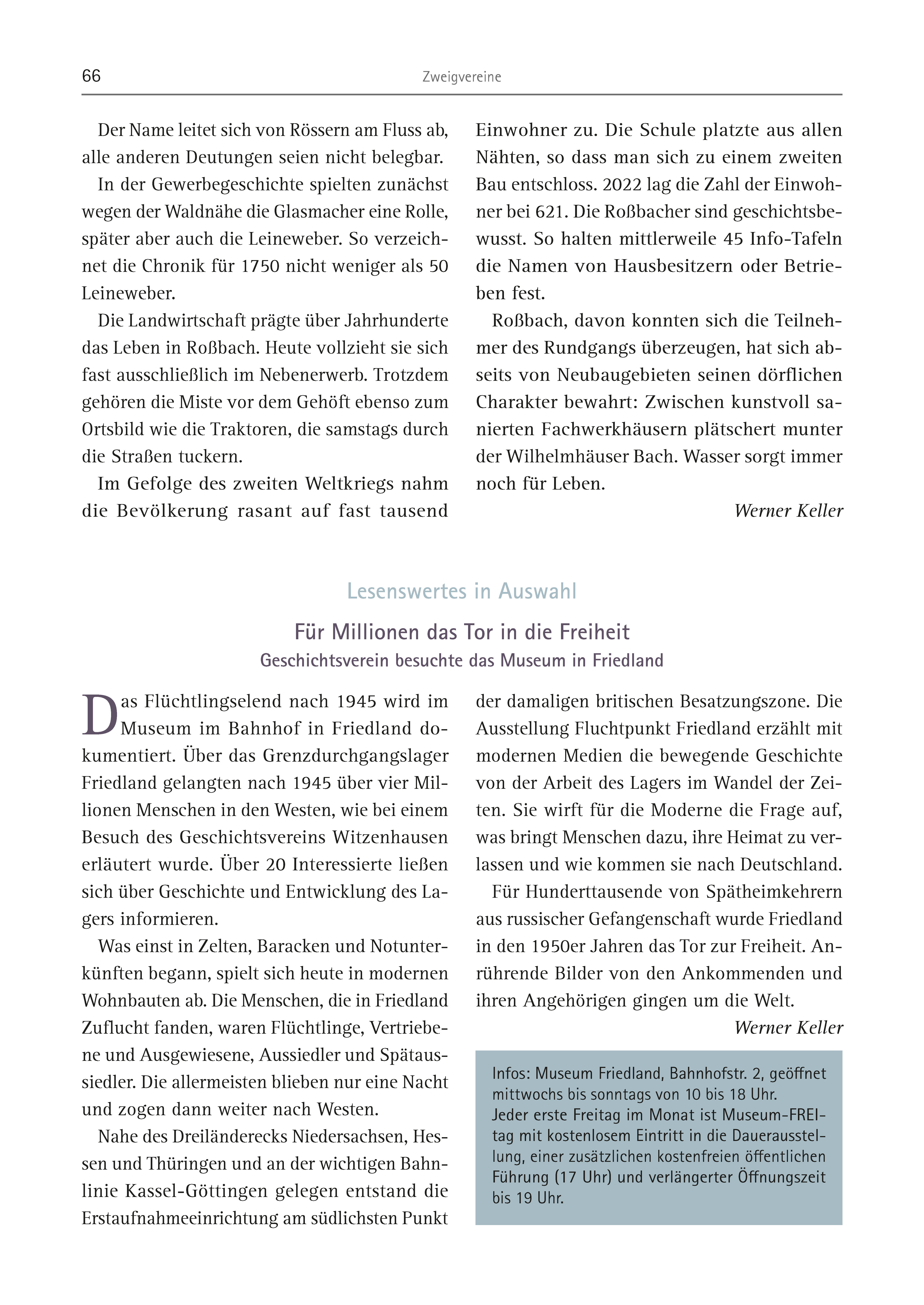 66 Zweigvereine Der Name leitet sich von Rössern am Fluss ab, alle anderen Deutungen seien nicht belegbar. In der Gewerbegeschichte spielten zunächst wegen der Waldnähe die Glasmacher eine Rolle, später aber auch die Leineweber. So verzeichnet die Chronik für 1750 nicht weniger als 50 Leineweber. Die Landwirtschaft prägte über Jahrhunderte das Leben in Roßbach. Heute vollzieht sie sich fast ausschließlich im Nebenerwerb. Trotzdem gehören die Miste vor dem Gehöft ebenso zum Ortsbild wie die Traktoren, die samstags durch die Straßen tuckern. Im Gefolge des zweiten Weltkriegs nahm die Bevölkerung rasant auf fast tausend Einwohner zu. Die Schule platzte aus allen Nähten, so dass man sich zu einem zweiten Bau entschloss. 2022 lag die Zahl der Einwohner bei 621. Die Roßbacher sind geschichtsbewusst. So halten mittlerweile 45 Info-Tafeln die Namen von Hausbesitzern oder Betrieben fest. Roßbach, davon konnten sich die Teilnehmer des Rundgangs überzeugen, hat sich abseits von Neubaugebieten seinen dörflichen Charakter bewahrt: Zwischen kunstvoll sanierten Fachwerkhäusern plätschert munter der Wilhelmhäuser Bach. Wasser sorgt immer noch für Leben. Werner Keller Das Flüchtlingselend nach 1945 wird im Museum im Bahnhof in Friedland dokumentiert. Über das Grenzdurchgangslager Friedland gelangten nach 1945 über vier Millionen Menschen in den Westen, wie bei einem Besuch des Geschichtsvereins Witzenhausen erläutert wurde. Über 20 Interessierte ließen sich über Geschichte und Entwicklung des Lagers informieren. Was einst in Zelten, Baracken und Notunterkünften begann, spielt sich heute in modernen Wohnbauten ab. Die Menschen, die in Friedland Zuflucht fanden, waren Flüchtlinge, Vertriebene und Ausgewiesene, Aussiedler und Spätaussiedler. Die allermeisten blieben nur eine Nacht und zogen dann weiter nach Westen. Nahe des Dreiländerecks Niedersachsen, Hessen und Thüringen und an der wichtigen Bahnlinie Kassel-Göttingen gelegen entstand die Erstaufnahmeeinrichtung am südlichsten Punkt der damaligen britischen Besatzungszone. Die Ausstellung Fluchtpunkt Friedland erzählt mit modernen Medien die bewegende Geschichte von der Arbeit des Lagers im Wandel der Zeiten. Sie wirft für die Moderne die Frage auf, was bringt Menschen dazu, ihre Heimat zu verlassen und wie kommen sie nach Deutschland. Für Hunderttausende von Spätheimkehrern aus russischer Gefangenschaft wurde Friedland in den 1950er Jahren das Tor zur Freiheit. Anrührende Bilder von den Ankommenden und ihren Angehörigen gingen um die Welt. Werner Keller Infos: Museum Friedland, Bahnhofstr. 2, geöffnet mittwochs bis sonntags von 10 bis 18 Uhr. Jeder erste Freitag im Monat ist Museum-FREItag mit kostenlosem Eintritt in die Dauerausstellung, einer zusätzlichen kostenfreien öffentlichen Führung (17 Uhr) und verlängerter Öffnungszeit bis 19 Uhr. Lesenswertes in Auswahl Für Millionen das Tor in die Freiheit Geschichtsverein besuchte das Museum in Friedland