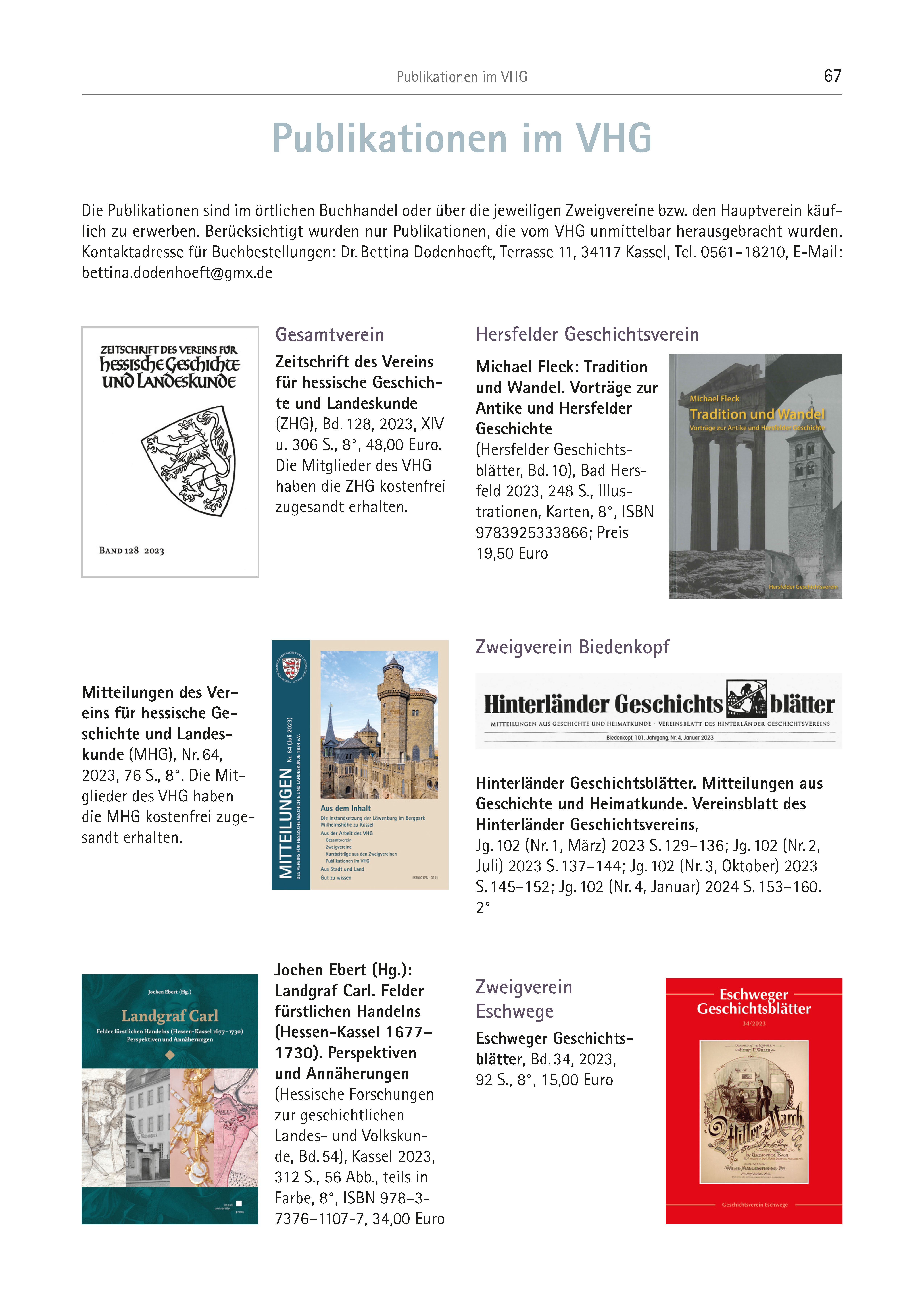 Publikationen im VHG 67 Publikationen im VHG Die Publikationen sind im örtlichen Buchhandel oder über die jeweiligen Zweigvereine bzw. den Hauptverein käuflich zu erwerben. Berücksichtigt wurden nur Publikationen, die vom VHG unmittelbar herausgebracht wurden. Kontaktadresse für Buchbestellungen: Dr. Bettina Dodenhoeft, Terrasse 11, 34117 Kassel, Tel. 0561–18210, E-Mail: bettina.dodenhoeft@gmx.de Zweigverein Eschwege Eschweger Geschichtsblätter, Bd. 34, 2023, 92 S., 8°, 15,00 Euro Hersfelder Geschichtsverein Michael Fleck: Tradition und Wandel. Vorträge zur Antike und Hersfelder Geschichte (Hersfelder Geschichtsblätter, Bd. 10), Bad Hersfeld 2023, 248 S., Illustrationen, Karten, 8°, ISBN 9783925333866; Preis 19,50 Euro Gesamtverein Zeitschrift des Vereins für hessische Geschichte und Landeskunde (ZHG), Bd. 128, 2023, XIV u. 306 S., 8°, 48,00 Euro. Die Mitglieder des VHG haben die ZHG kostenfrei zugesandt erhalten. Mitteilungen des Vereins für hessische Geschichte und Landeskunde (MHG), Nr. 64, 2023, 76 S., 8°. Die Mitglieder des VHG haben die MHG kostenfrei zugesandt erhalten. Zweigverein Biedenkopf Hinterländer Geschichtsblätter. Mitteilungen aus Geschichte und Heimatkunde. Vereinsblatt des Hinterländer Geschichtsvereins, Jg. 102 (Nr. 1, März) 2023 S. 129–136; Jg. 102 (Nr. 2, Juli) 2023 S. 137–144; Jg. 102 (Nr. 3, Oktober) 2023 S. 145–152; Jg. 102 (Nr. 4, Januar) 2024 S. 153–160. 2° Jochen Ebert (Hg.): Landgraf Carl. Felder fürstlichen Handelns (Hessen-Kassel 1677– 1730). Perspektiven und Annäherungen (Hessische Forschungen zur geschichtlichen Landes- und Volkskunde, Bd. 54), Kassel 2023, 312 S., 56 Abb., teils in Farbe, 8°, ISBN 978–3- 7376–1107-7, 34,00 Euro