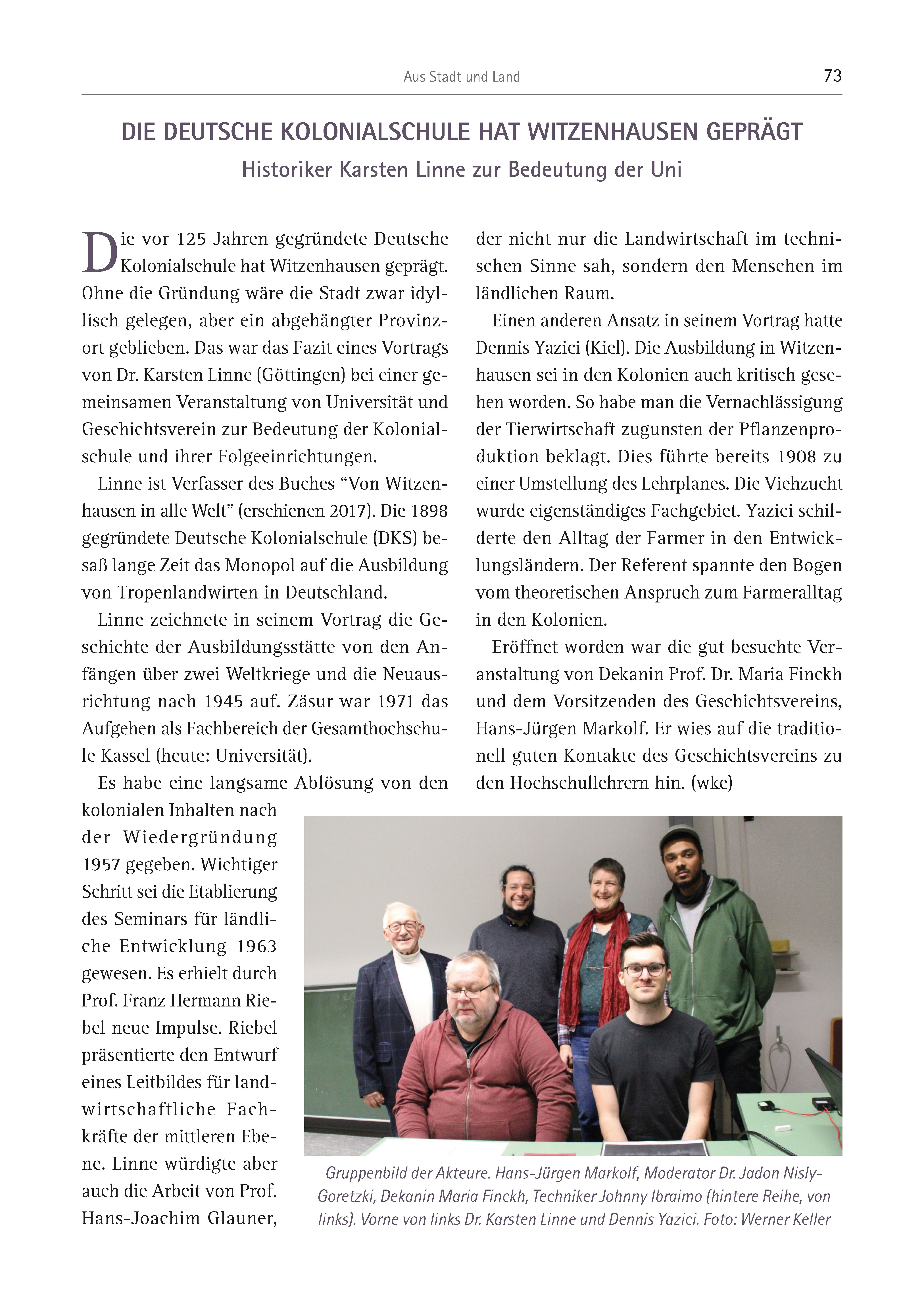 Aus Stadt und Land 73 Die vor 125 Jahren gegründete Deutsche Kolonialschule hat Witzenhausen geprägt. Ohne die Gründung wäre die Stadt zwar idyllisch gelegen, aber ein abgehängter Provinzort geblieben. Das war das Fazit eines Vortrags von Dr. Karsten Linne (Göttingen) bei einer gemeinsamen Veranstaltung von Universität und Geschichtsverein zur Bedeutung der Kolonialschule und ihrer Folgeeinrichtungen. Linne ist Verfasser des Buches “Von Witzenhausen in alle Welt” (erschienen 2017). Die 1898 gegründete Deutsche Kolonialschule (DKS) besaß lange Zeit das Monopol auf die Ausbildung von Tropenlandwirten in Deutschland. Linne zeichnete in seinem Vortrag die Geschichte der Ausbildungsstätte von den Anfängen über zwei Weltkriege und die Neuausrichtung nach 1945 auf. Zäsur war 1971 das Aufgehen als Fachbereich der Gesamthochschule Kassel (heute: Universität). Es habe eine langsame Ablösung von den kolonialen Inhalten nach der Wiedergründung 1957 gegeben. Wichtiger Schritt sei die Etablierung des Seminars für ländliche Entwicklung 1963 gewesen. Es erhielt durch Prof. Franz Hermann Riebel neue Impulse. Riebel präsentierte den Entwurf eines Leitbildes für landwirtschaftliche Fachkräfte der mittleren Ebene. Linne würdigte aber auch die Arbeit von Prof. Hans-Joachim Glauner, der nicht nur die Landwirtschaft im technischen Sinne sah, sondern den Menschen im ländlichen Raum. Einen anderen Ansatz in seinem Vortrag hatte Dennis Yazici (Kiel). Die Ausbildung in Witzenhausen sei in den Kolonien auch kritisch gesehen worden. So habe man die Vernachlässigung der Tierwirtschaft zugunsten der Pflanzenproduktion beklagt. Dies führte bereits 1908 zu einer Umstellung des Lehrplanes. Die Viehzucht wurde eigenständiges Fachgebiet. Yazici schilderte den Alltag der Farmer in den Entwicklungsländern. Der Referent spannte den Bogen vom theoretischen Anspruch zum Farmeralltag in den Kolonien. Eröffnet worden war die gut besuchte Veranstaltung von Dekanin Prof. Dr. Maria Finckh und dem Vorsitzenden des Geschichtsvereins, Hans-Jürgen Markolf. Er wies auf die traditionell guten Kontakte des Geschichtsvereins zu den Hochschullehrern hin. (wke) DIE DEUTSCHE KOLONIALSCHULE HAT WITZENHAUSEN GEPRÄGT Historiker Karsten Linne zur Bedeutung der Uni Gruppenbild der Akteure. Hans-Jürgen Markolf, Moderator Dr. Jadon Nisly- Goretzki, Dekanin Maria Finckh, Techniker Johnny Ibraimo (hintere Reihe, von links). Vorne von links Dr. Karsten Linne und Dennis Yazici. Foto: Werner Keller