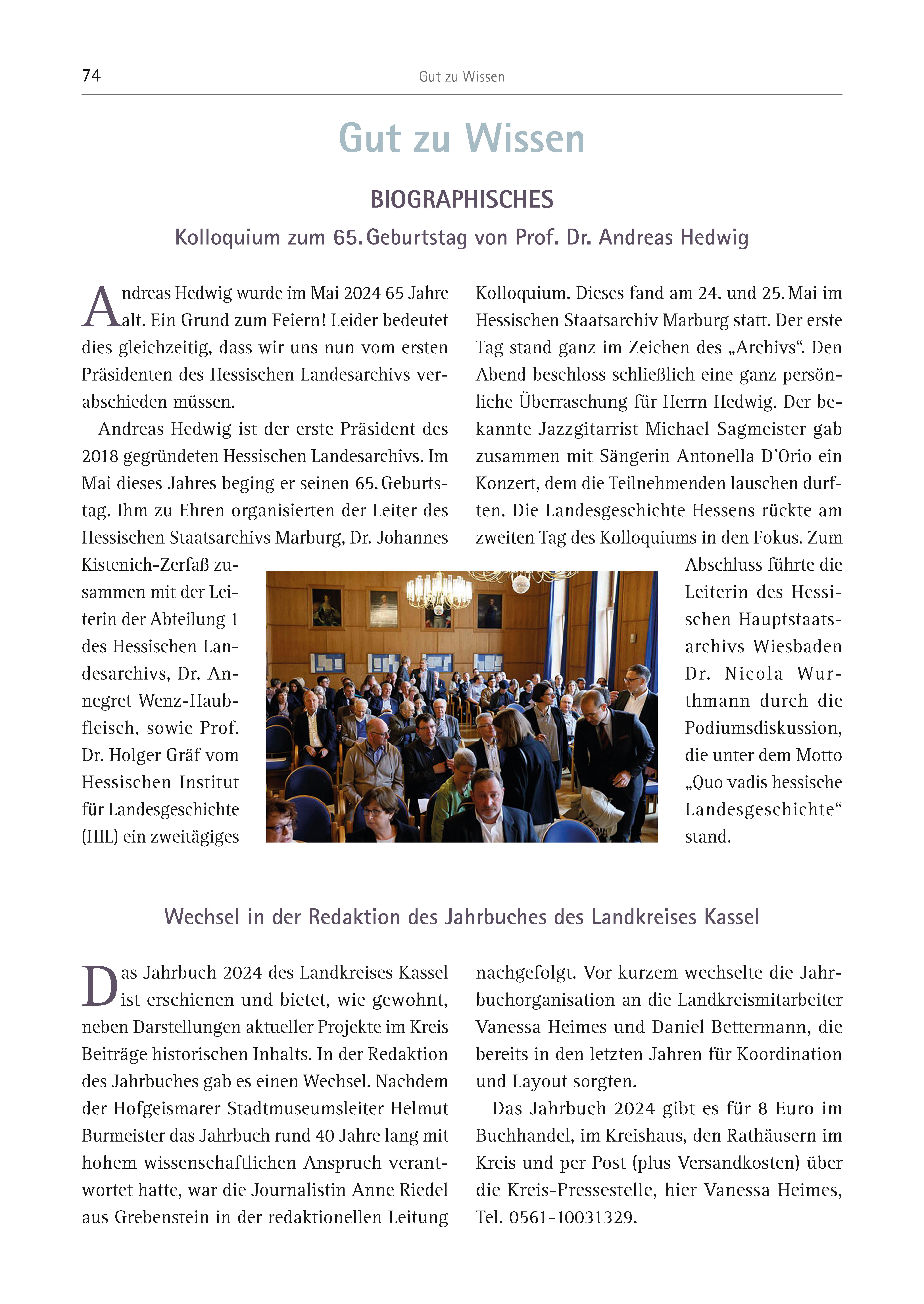 74 Gut zu Wissen Andreas Hedwig wurde im Mai 2024 65 Jahre alt. Ein Grund zum Feiern! Leider bedeutet dies gleichzeitig, dass wir uns nun vom ersten Präsidenten des Hessischen Landesarchivs verabschieden müssen. Andreas Hedwig ist der erste Präsident des 2018 gegründeten Hessischen Landesarchivs. Im Mai dieses Jahres beging er seinen 65. Geburtstag. Ihm zu Ehren organisierten der Leiter des Hessischen Staatsarchivs Marburg, Dr. Johannes Kistenich-Zerfaß zusammen mit der Leiterin der Abteilung 1 des Hessischen Landesarchivs, Dr. Annegret Wenz-Haubfleisch, sowie Prof. Dr. Holger Gräf vom Hessischen Institut für Landesgeschichte (HIL) ein zweitägiges Kolloquium. Dieses fand am 24. und 25. Mai im Hessischen Staatsarchiv Marburg statt. Der erste Tag stand ganz im Zeichen des „Archivs“. Den Abend beschloss schließlich eine ganz persönliche Überraschung für Herrn Hedwig. Der bekannte Jazzgitarrist Michael Sagmeister gab zusammen mit Sängerin Antonella D’Orio ein Konzert, dem die Teilnehmenden lauschen durften. Die Landesgeschichte Hessens rückte am zweiten Tag des Kolloquiums in den Fokus. Zum Abschluss führte die Leiterin des Hessischen Hauptstaatsarchivs Wiesbaden Dr. Nicola Wurthmann durch die Podiumsdiskussion, die unter dem Motto „Quo vadis hessische Landesgeschichte“ stand. BIOGRAPHISCHES Kolloquium zum 65. Geburtstag von Prof. Dr. Andreas Hedwig Gut zu Wissen Das Jahrbuch 2024 des Landkreises Kassel ist erschienen und bietet, wie gewohnt, neben Darstellungen aktueller Projekte im Kreis Beiträge historischen Inhalts. In der Redaktion des Jahrbuches gab es einen Wechsel. Nachdem der Hofgeismarer Stadtmuseumsleiter Helmut Burmeister das Jahrbuch rund 40 Jahre lang mit hohem wissenschaftlichen Anspruch verantwortet hatte, war die Journalistin Anne Riedel aus Grebenstein in der redaktionellen Leitung nachgefolgt. Vor kurzem wechselte die Jahrbuchorganisation an die Landkreismitarbeiter Vanessa Heimes und Daniel Bettermann, die bereits in den letzten Jahren für Koordination und Layout sorgten. Das Jahrbuch 2024 gibt es für 8 Euro im Buchhandel, im Kreishaus, den Rathäusern im Kreis und per Post (plus Versandkosten) über die Kreis-Pressestelle, hier Vanessa Heimes, Tel. 0561-10031329. Wechsel in der Redaktion des Jahrbuches des Landkreises Kassel