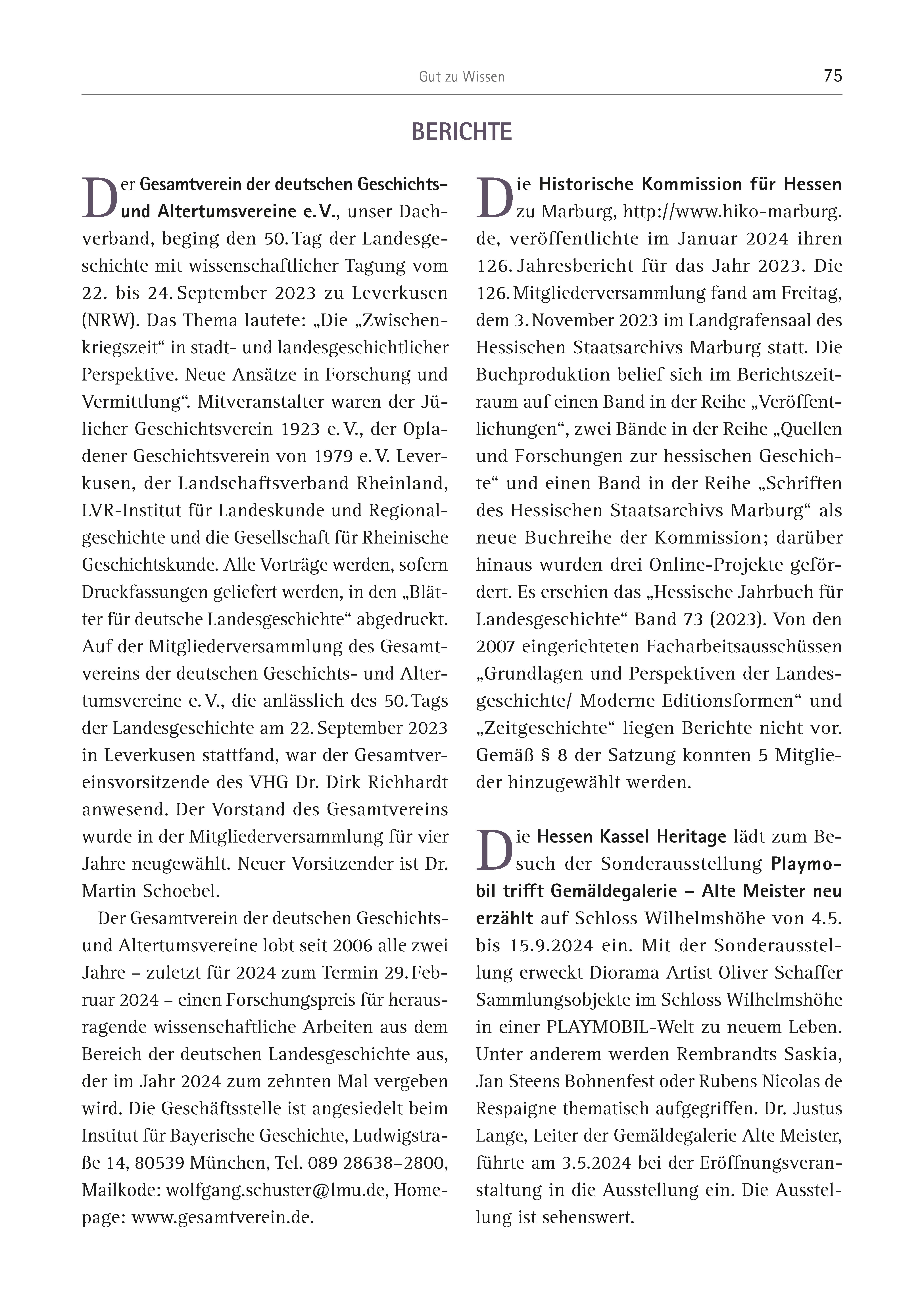 Gut zu Wissen 75 Der Gesamtverein der deutschen Geschichtsund Altertumsvereine e. V., unser Dachverband, beging den 50. Tag der Landesgeschichte mit wissenschaftlicher Tagung vom 22. bis 24. September 2023 zu Leverkusen (NRW). Das Thema lautete: „Die „Zwischenkriegszeit“ in stadt- und landesgeschichtlicher Perspektive. Neue Ansätze in Forschung und Vermittlung“. Mitveranstalter waren der Jülicher Geschichtsverein 1923 e. V., der Opladener Geschichtsverein von 1979 e. V. Leverkusen, der Landschaftsverband Rheinland, LVR-Institut für Landeskunde und Regionalgeschichte und die Gesellschaft für Rheinische Geschichtskunde. Alle Vorträge werden, sofern Druckfassungen geliefert werden, in den „Blätter für deutsche Landesgeschichte“ abgedruckt. Auf der Mitgliederversammlung des Gesamtvereins der deutschen Geschichts- und Altertumsvereine e. V., die anlässlich des 50. Tags der Landesgeschichte am 22. September 2023 in Leverkusen stattfand, war der Gesamtvereinsvorsitzende des VHG Dr. Dirk Richhardt anwesend. Der Vorstand des Gesamtvereins wurde in der Mitgliederversammlung für vier Jahre neugewählt. Neuer Vorsitzender ist Dr. Martin Schoebel. Der Gesamtverein der deutschen Geschichtsund Altertumsvereine lobt seit 2006 alle zwei Jahre – zuletzt für 2024 zum Termin 29. Februar 2024 – einen Forschungspreis für herausragende wissenschaftliche Arbeiten aus dem Bereich der deutschen Landesgeschichte aus, der im Jahr 2024 zum zehnten Mal vergeben wird. Die Geschäftsstelle ist angesiedelt beim Institut für Bayerische Geschichte, Ludwigstraße 14, 80539 München, Tel. 089 28638–2800, Mailkode: wolfgang.schuster@lmu.de, Homepage: www.gesamtverein.de. Die Historische Kommission für Hessen zu Marburg, http://www.hiko-marburg. de, veröffentlichte im Januar 2024 ihren 126. Jahresbericht für das Jahr 2023. Die 126. Mitgliederversammlung fand am Freitag, dem 3. November 2023 im Landgrafensaal des Hessischen Staatsarchivs Marburg statt. Die Buchproduktion belief sich im Berichtszeitraum auf einen Band in der Reihe „Veröffentlichungen“, zwei Bände in der Reihe „Quellen und Forschungen zur hessischen Geschichte“ und einen Band in der Reihe „Schriften des Hessischen Staatsarchivs Marburg“ als neue Buchreihe der Kommission; darüber hinaus wurden drei Online-Projekte gefördert. Es erschien das „Hessische Jahrbuch für Landesgeschichte“ Band 73 (2023). Von den 2007 eingerichteten Facharbeitsausschüssen „Grundlagen und Perspektiven der Landesgeschichte/ Moderne Editionsformen“ und „Zeitgeschichte“ liegen Berichte nicht vor. Gemäß § 8 der Satzung konnten 5 Mitglieder hinzugewählt werden. Die Hessen Kassel Heritage lädt zum Besuch der Sonderausstellung Playmobil trifft Gemäldegalerie – Alte Meister neu erzählt auf Schloss Wilhelmshöhe von 4.5. bis 15.9.2024 ein. Mit der Sonderausstellung erweckt Diorama Artist Oliver Schaffer Sammlungsobjekte im Schloss Wilhelmshöhe in einer PLAYMOBIL-Welt zu neuem Leben. Unter anderem werden Rembrandts Saskia, Jan Steens Bohnenfest oder Rubens Nicolas de Respaigne thematisch aufgegriffen. Dr. Justus Lange, Leiter der Gemäldegalerie Alte Meister, führte am 3.5.2024 bei der Eröffnungsveranstaltung in die Ausstellung ein. Die Ausstellung ist sehenswert. BERICHTE